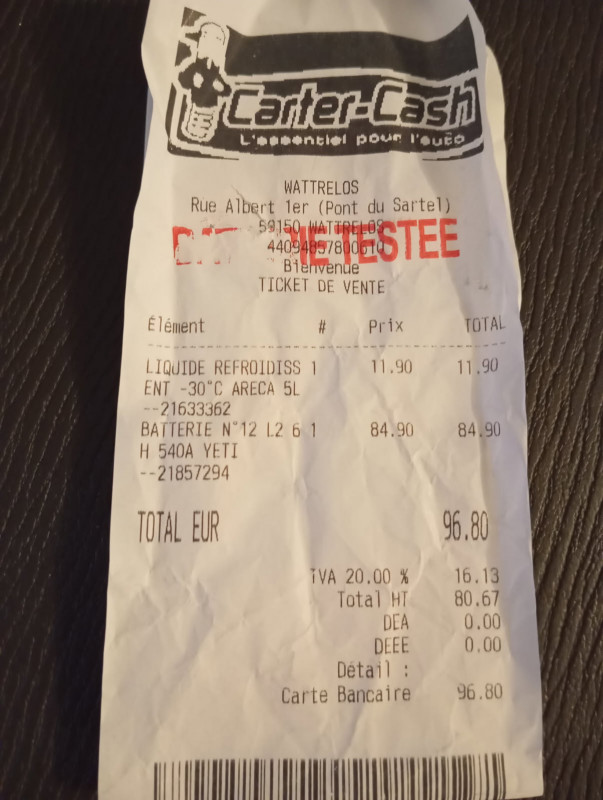facture fournie à l'achat de la batterie avec le ticket de garantie.