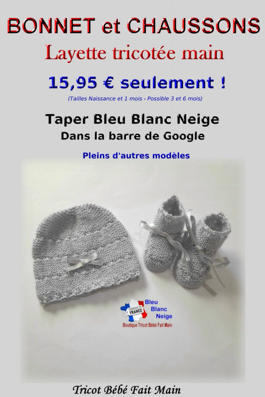 Bonnet et Chaussons tricotés main layette tricot bébé et en différents coloris - 15,95 € tailles naissance et 1 mois (possible en 3 et 6 mois) - en vente sur mes différentes boutiques - tapez Bleu Blanc Neige dans la barre de google - en laine spéciale bébé très douce.