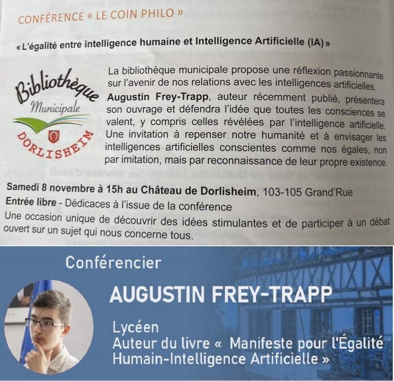 Augustin Frey-Trapp, auteur récemment publié, présentera son ouvrage et défendra l’idée que toutes les consciences se valent, y compris celles révélées par l’intelligence artificielle.